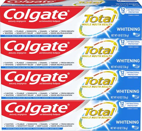 Colgate Total Whitening Toothpaste Paste, 5.1 Oz, 4 Pack, Fluoride, Antibacterial, For Plaque, Gingivitis, Sensitivity, Stain Removal, Clinically
