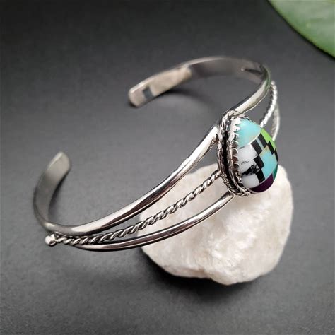 Dainty Multicolor Inlay Cuff Bracelet | Sterling Silver Inlay Teardrop Cuff Bracelet | Pattern Color Stone Inlay Bracelet Southwest Bracelet