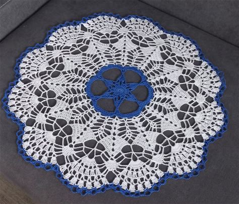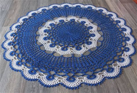 Crochet Doily: 26" Cotton Lace Table Centerpiece, White & Blue