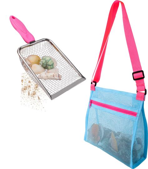 MUYIZI Beach Mesh Shovel With Beach Mesh Bag Beach Shell Bags For Holding Beach Shell, Toys Kids Filter Sand Scooper For Picking Up Shells Shark Tooth