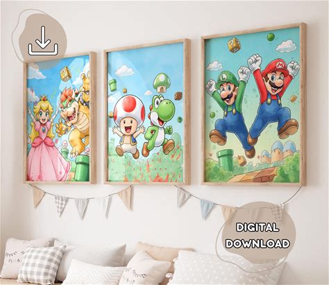 Hand-Drawing Super Mario Bros Prints, Mario And Luigi, Prints For Kids, Baby Shower, Nursery Cartoon Art, Playroom, Bowser Toad Peach Yoshi